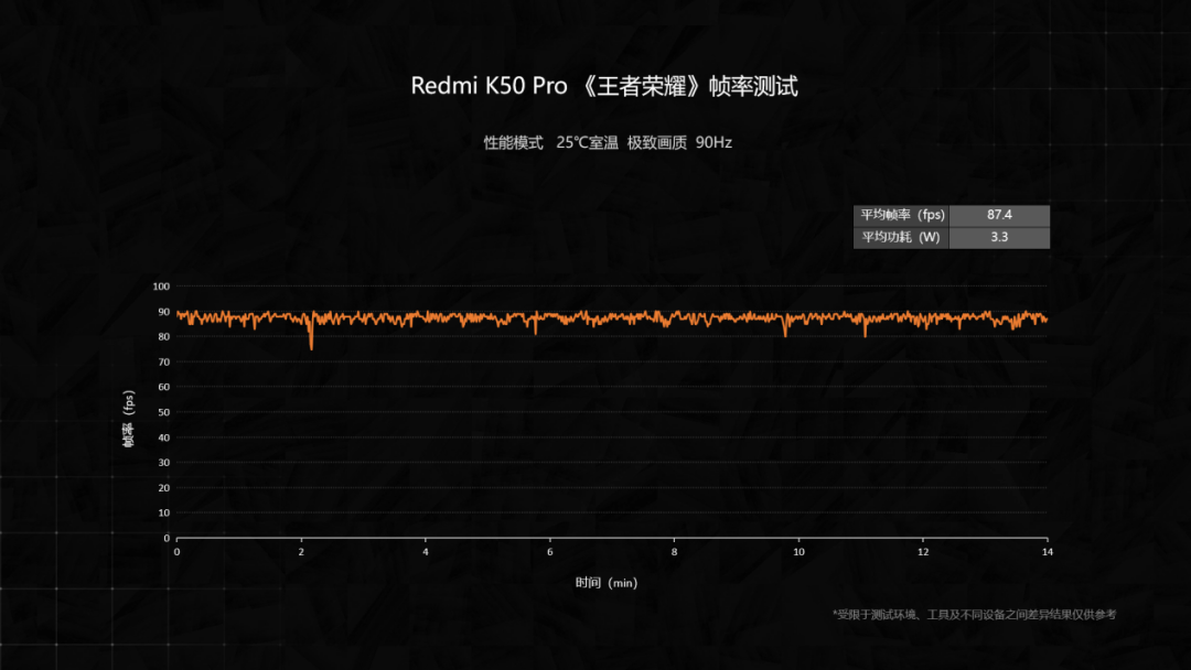 当然,光有理论还不够,我们又进行了游戏实测。所有测试都在室温 25℃,开启性能模式下进行。《王者荣耀》最高画质 90Hz,15 分钟平均帧率 87.4,基本全程稳定,不过相比之前的 OPPO Find X5 Pro 波动稍大一些,整机平均功耗约 3.3W。