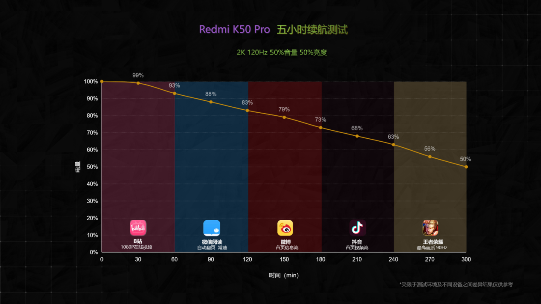 这次 K50 Pro 也内置了不少省电策略,像是 2K 分辨率、120Hz 这些都有自定义开关,游戏长时间没有操作会提示降低分辨率和刷新率等等。针对续航,我们也进行了模拟日常从低到高各种负载的五小时续航测试,剩余电量 50%,这个成绩还是相当不错的,满足日常一天以上的使用时间是没有问题的。