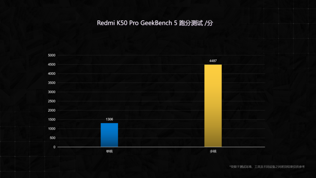 当然,娱乐兔看看就行,下面我们分别对 CPU 及 GPU 性能进行测试。K50 Pro GeekBench 5 CPU 单核成绩 1306 分,多核则是 4487 分,这个成绩战胜骁龙 8 Gen 1 毫无悬念,也比之前我们测试的 OPPO Find X5 Pro 天玑版略高一点。功耗方面,GeekBench 5 平台单核功耗约为 2.7W,多核为 6.2W,换算能效比分别为 484 和 724。