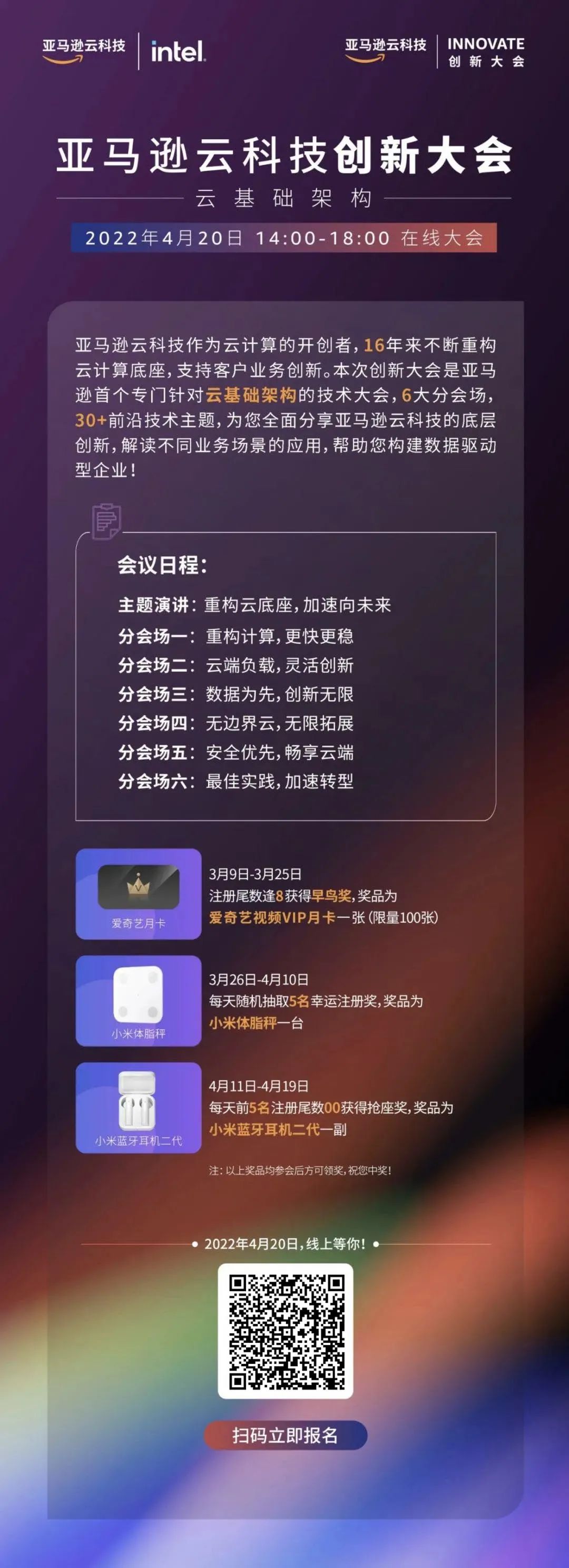 2022 年 4 月 20 日,亚马逊云科技将在线召开 INNOVATE 创新大会,这也是亚马逊首个专门针对云基础架构的技术大会,设置 6 大分会场、30+ 前沿技术主题,将更全面、更详细地分享亚马逊云科技的底层创新,解读不同业务场景的应用,帮助您构建数据驱动型企业!