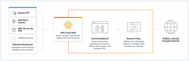 当网络在全球范围内延伸并且还需要混合各种技术时,企业构建、管理和监控它们的复杂度也会明显增加。在 2021 年 re:Invent 大会上,亚马逊云科技宣布了 Cloud WAN 全球网络托管服务。借助这项网络服务,企业可以借助于亚马逊的骨干网,使用 Cloud WAN 图形界面一键创建属于自己的全球网,实现设置中转网关或云连接,监控网络运行状况、安全性和性能等功能。