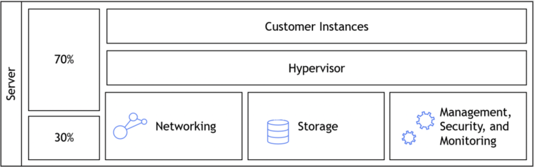 这不是一蹴而就的事情,2013 年,亚马逊发布了 EC2 C3 实例,将网络进程卸载到硬件(将功能从软件转移到硬件)。2014 年,亚马逊云科技与 Annapurna Labs 合作,再次推出了 EC2 C4 实例。C4 将 EBS 存储卸载到硬件中,但仍然依赖英特尔至强芯片作为控制器。据报道,亚马逊云科技在 2015 年斥资 3.5 亿美元收购了 Annapurna,引入 C5 实例,用 Nitro hypervisor 取代了 Xen,将虚拟机与 ASIC 紧密耦合。Werner Vogels 表示,这个里程碑卸载了控制平面和其余 I/O,使用近 100% 的处理来支持客户工作负载,还启用了裸机版本的计算,催生了与 VMware 的合作伙伴关系,以启动 VMware Cloud on AWS。2017 年,亚马逊正式推出完整版 Nitro。
