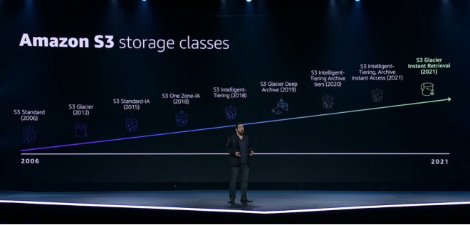 2006 年的时候,S3 只有 8 个服务(Services),到 2019 年,S3 已经拥有 262 个了。而且亚马逊致力让 S3 拥有更高性能、更低成本,推出了七种不同层次的存储产品:Standard、Intelligent Tiering、Infrequent Access、One-Zone Infrequent Access、 Glacier、Glacier Deep Archive,以及 S3 Intelligent Tiering。S3 Intelligent Tiering(智能分层)产品又分为“频繁访问”和“非频繁访问”两个层级,会自动将连续 30 天未访问的对象移动到“非频繁访问”层,降低了运营复杂度。2021 年,智能分层也从2个层级增加到了3个层级,添加了新推出的归档即时访问层,最经典的存储仍在不断进化。