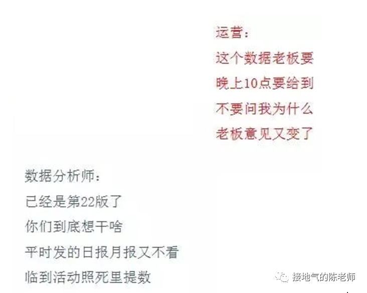 二来数据分析师主动给的报告往往没人看,运营最喜欢自己跑数写报告,还专门衍生出来一个岗位:数据运营(虽然数据运营本意不是这个,但在很多公司硬生生做成了写sql的运营)。