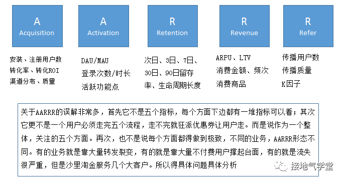 外行眼中运营数据分析无非(是滴,外行很喜欢用无非这俩字)就是AARRR与漏斗模型。AARRR用来描述用户状况的指标体系,基本构成如下图: