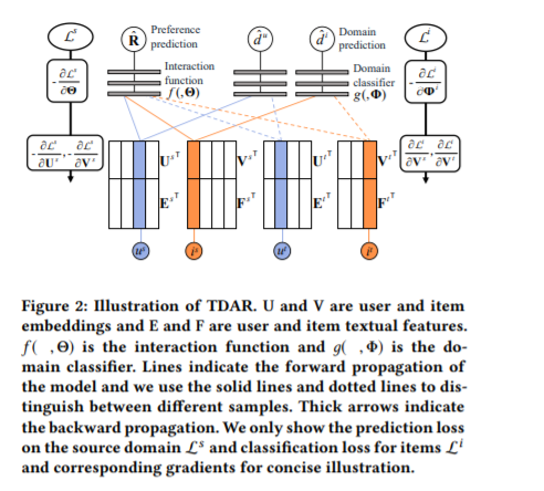 在这种极端情况下,直接对齐两个数据集的嵌入并不理想,因为这两个潜在空间编码的信息非常不同。因此,作者采用领域不变(domain-invariant)的文本特性作为锚点来对齐潜在空间。为了对齐嵌入,我们为每个用户和项提取文本特性,并将它们与用户和物品的嵌入一起提供给域分类器。训练嵌入来迷惑分类器,并将文本特征固定为锚点。通过域适应,将源域内的分布模式转移到目标域。由于目标部分可以通过区域自适应来监督,因此我们在目标数据集中放弃了负采样以避免标签噪声。