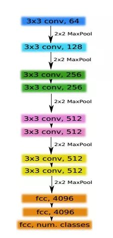 TernausNet 采用 VGG11 作为 U-Net 网络的编码器。如图 2 所示,VGG11 由 11 个向前传播的网络层组成。其中有 8 个卷积层,每个卷积层采用了 3*3 的卷积核,每个卷积层后都紧跟一个 ReLU 激励函数层,第 1、2、4、6、8 个卷积层后都紧跟一个 2*2 的最大池化操作,每次操作后特征图尺寸减半。第一个卷积层通道数为 64,第二层通道数为 128,第三层第四层通道数为 256,第五层到第八层通道数为 512。为了达到语义分割的目的,编码器采用了类似 FCN 的设计思路,将 VGG11 的最后 3 层替换为了一个 512 通道的卷积层,它同时也是编码器与解码器的「瓶颈」,将 U-Net 的左右两个部分分开。