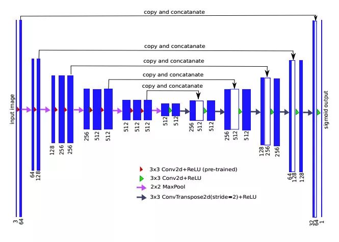 为了构建解码器,TernausNet 用两倍于特征图大小的转置卷积层同时将通道数减半。转置卷积的输出接着被连接到相应的编码器输出。得到的特征图通过卷积运算处理,保持通道数量与对应的编码器相同。上采样步骤重复了 5 次用来与 5 个最大池化层配对。如图 1 所示,由于 TernausNet 有 5 个最大池化层,每层下采样图像两次,因此,只有边可以被 32,即 2 的 5 次方,整除的图像可以用作此模型的输入。