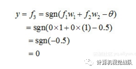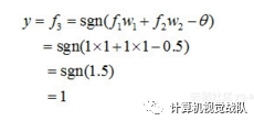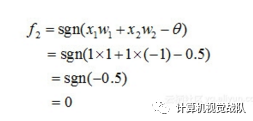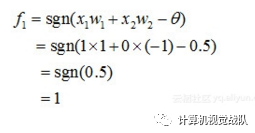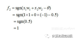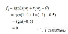 接下来详述整个实现过程。假设激活函数为阶跃函数(sgn函数),则:当x>0时,f(x)输出为1,反之输出0。对于x1和x2均为1时(x1和x2相同),则隐层的神经元1为: