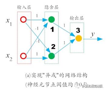 假设各个神经元的阈值均为0.5,权值如图6-1所示,就可实现“异或”功能。