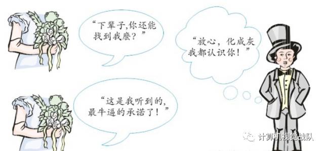 分布式表征表示有很多优点。其中最重要的一点,莫过于当部分神经元发生故障时,信息的表达不会出现覆灭性的破坏。比如,我们常在影视作品中看到这样的场景,仇人相见分外眼红,一人(A)发狠地说,“你化成灰,我都认识你(B)!”这里并不是说B真的“化成灰”了,而是说,虽然时过境迁,物是人非,当事人B外表也变了很多(对于识别人A来说,B在其大脑中的信息存储是残缺的),但没有关系,只要B的部分核心特征还在,那A还是能够把B认得清清楚楚、真真切切!人类的大脑还是真的厉害啊!(现在这句话,也被好端端地被玩坏了,见图6-3)