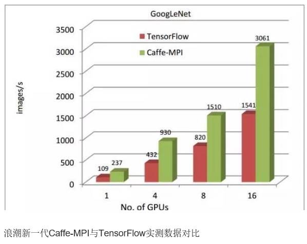 针对上述情况,浪潮发布了集群版的Caffe版本——Caffe-MPI,并在GitHub上开源公布所有代码,以此为客户提供更强大的深度学习平台。根据浪潮提供的官方数据,使用GoogleNet模型,在不同GPU数量的情况下,对比每秒处理图像的速度,Caffe-MPI几乎是TensorFlow的两倍。