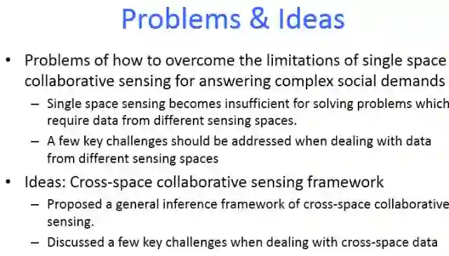 无线传感网络、社交网络以及可穿戴感知技术的发展推动了感知技术在理解社会动态研究中的应用。协同感知作为汇集不同实体间感知和计算能力的技术,已经成为一种被广泛应用的感知和计算框架。本文首先详细回顾了协同感知技术发展的历史脉络,其主要涵盖面向物理、信息和社会三种单一空间的协同感知。然后,本文将单一空间的协同感知概念扩展到跨空间协同感知,并提出一个通用的参考模型框架用于说明跨空间协同感知的不同机制。此外,本文还简要梳理了跨空间协同感知的早期研究工作,并基于一个典型的研究案例阐述了该技术的具体实施机理。最后,鉴于跨空间协同感知技术仍处于其起步阶段,本文在结尾处提出了一些潜在的科学问题和关键的技术挑战。