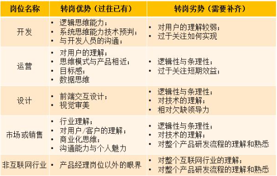 如果是运营、技术、UI设计,本身就在互联网氛围中,也是产品经理日常工作接触的一环,有天然的转岗优势。