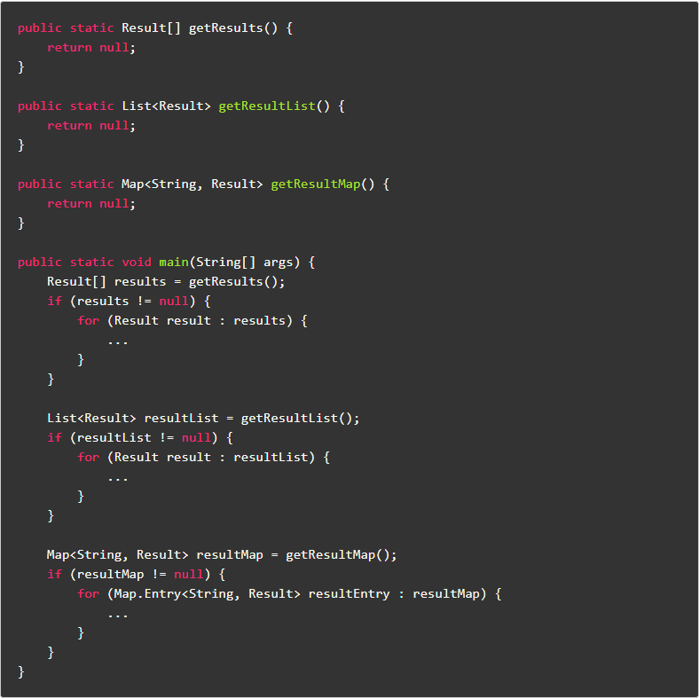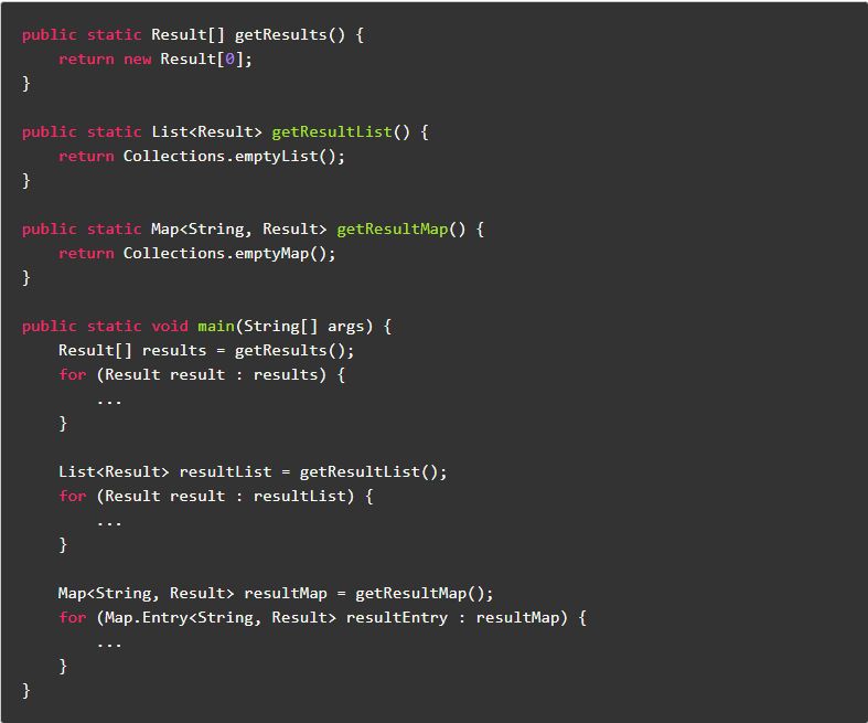 返回 null ,需要调用方强制检测 null ,否则就会抛出空指针异常。返回空数组或空集合,有效地避免了调用方因为未检测 null 而抛出空指针异常,还可以删除调用方检测 null 的语句使代码更简洁。