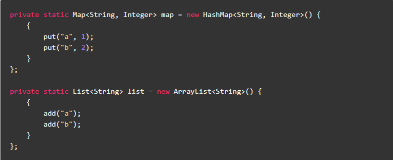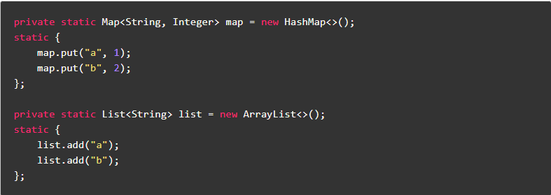 对于集合类型的静态成员变量,不要使用集合实现来赋值,应该使用静态代码块赋值。