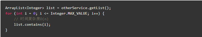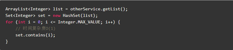 在 java 集合类库中,List 的 contains 方法普遍时间复杂度是 O(n) ,如果在代码中需要频繁调用 contains 方法查找数据,可以先将 list 转换成 HashSet 实现,将 O(n) 的时间复杂度降为 O(1) 。