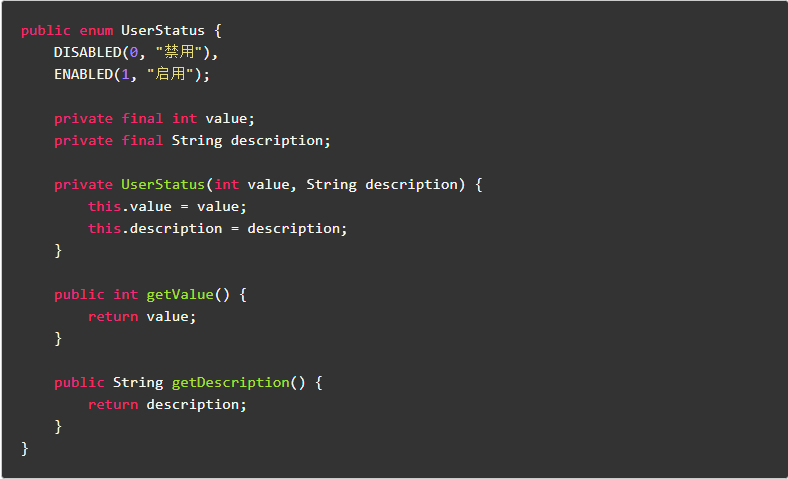 枚举通常被当做常量使用,如果枚举中存在公共属性字段或设置字段方法,那么这些枚举常量的属性很容易被修改。理想情况下,枚举中的属性字段是私有的,并在私有构造函数中赋值,没有对应的 Setter 方法,最好加上 final 修饰符。