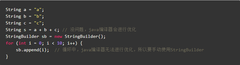 一般的字符串拼接在编译期 java 会进行优化,但是在循环中字符串拼接,java 编译期无法做到优化,所以需要使用 StringBuilder 进行替换。