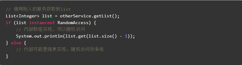 大家都知道数组和链表的区别:数组的随机访问效率更高。当调用方法获取到 List 后,如果想随机访问其中的数据,并不知道该数组内部实现是链表还是数组,怎么办呢?可以判断它是否实现 RandomAccess 接口。