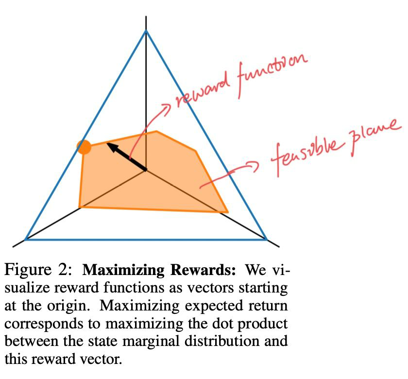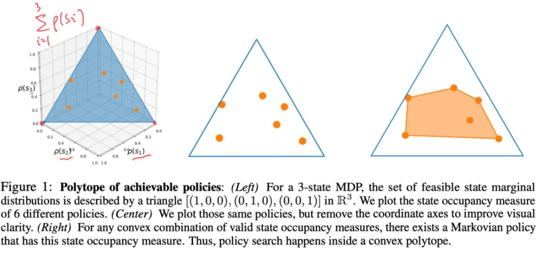 Proposition 1. 给定一系列可行的 state marginals(state-occupancy 分布,即图中黄色点),那么这些可达的 state marginals 的所有凸组合一定也是可达的,这些可能的所有凸组合构成了整个可行空间(图中橘黄色多面体)。