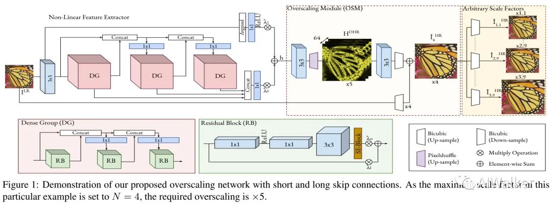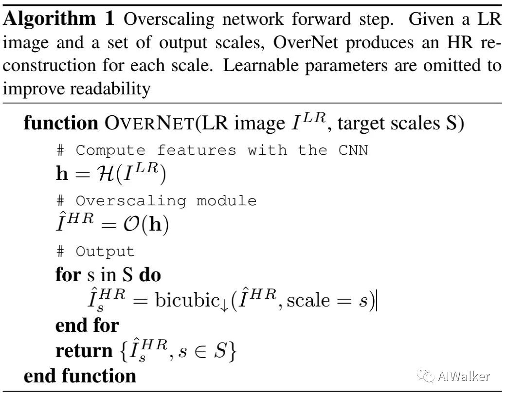 为生成更精度且更少伪影的图像,作者提出了提出了过尺度模块,它基于这样的假设:过尺度可以为同一像素生成更多的值,这些值可以起到集成的作用,进而可以降低噪声。假设N为最大超分尺度,作者首先过尺度特征 ,它的分辨率尺度为 。因此,基于所提取的特征h,作者采用3x3卷积+pixelshuffle得到过尺度特征: