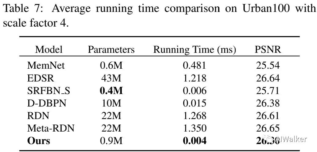 作者同时还对比了所提方法与其他超分方法的性能和计算量对比,见下表。