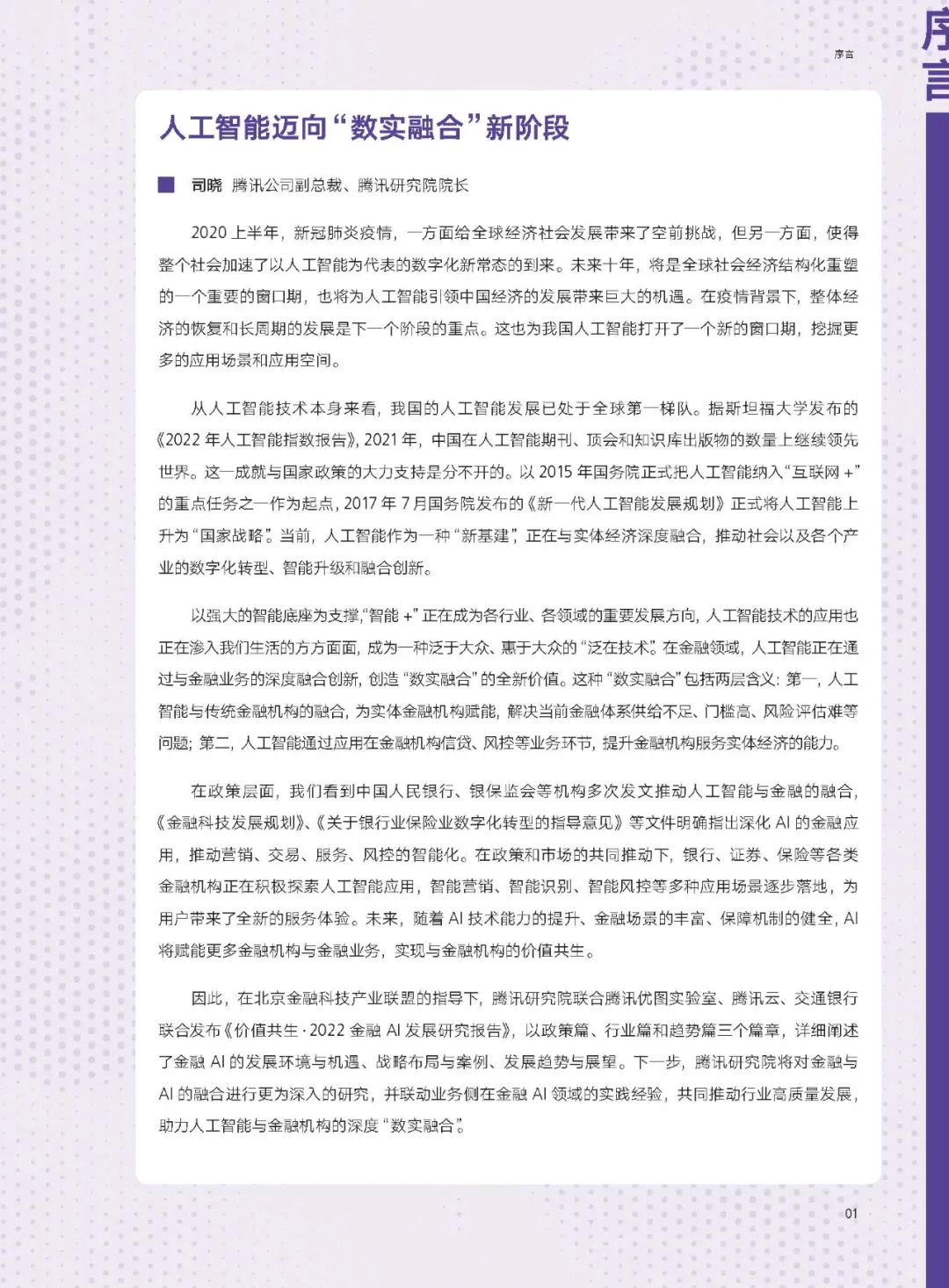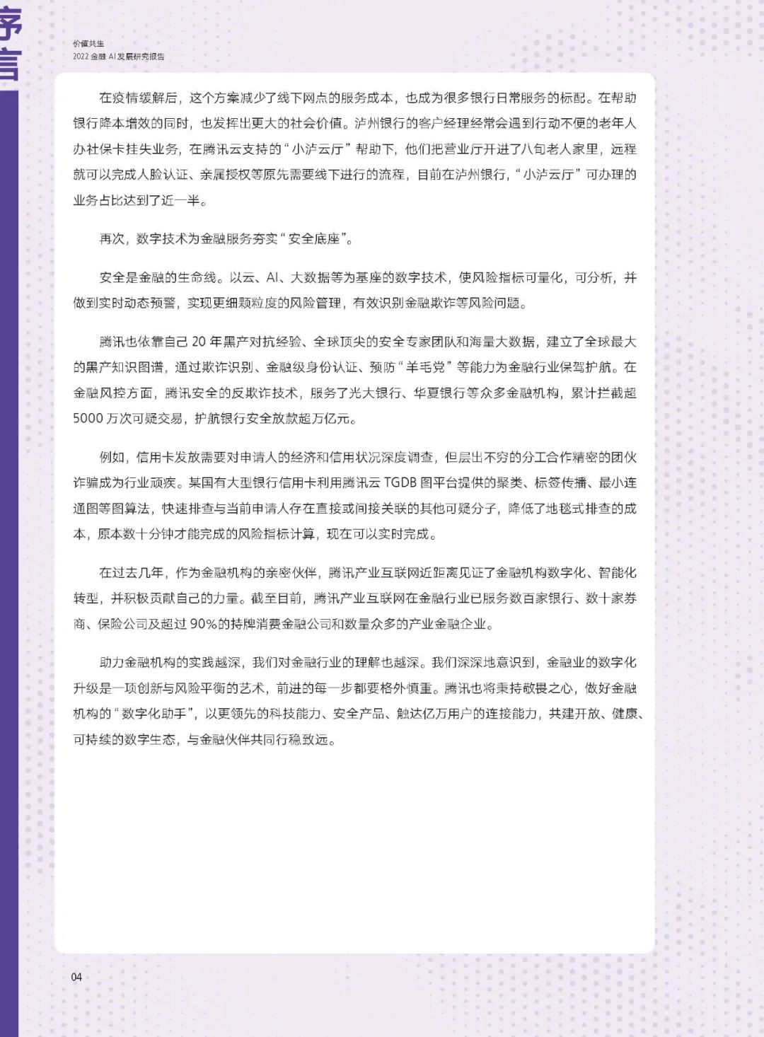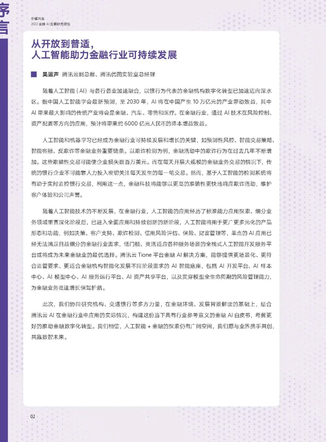 9月3日,2022世界人工智能大会腾讯论坛上,腾讯发布国内首份金融AI白皮书——《价值共生·2022金融AI发展研究报告》(以下简称“报告”)。报告由北京金融科技产业联盟作为指导单位,由腾讯研究院与腾讯优图实验室、腾讯云、交通银行组成的联合课题组,联动腾讯内部及金融机构业务侧,对国内多个金融机构进行了近五个月的调研,并将调研成果与课题组对金融AI的发展趋势思考进行汇总,共同编制而成。