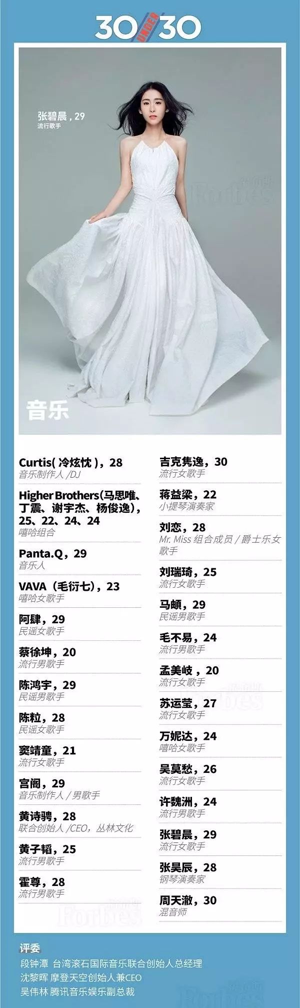 音乐领域上榜人中除了流行歌手张碧晨、黄子韬、毛不易、蔡徐坤等,还有民谣歌手陈粒、马頔,嘻哈歌手万妮达、VAVA,还有DJ、钢琴家和小提琴家等。总之就是各种音乐类别都覆盖到了。