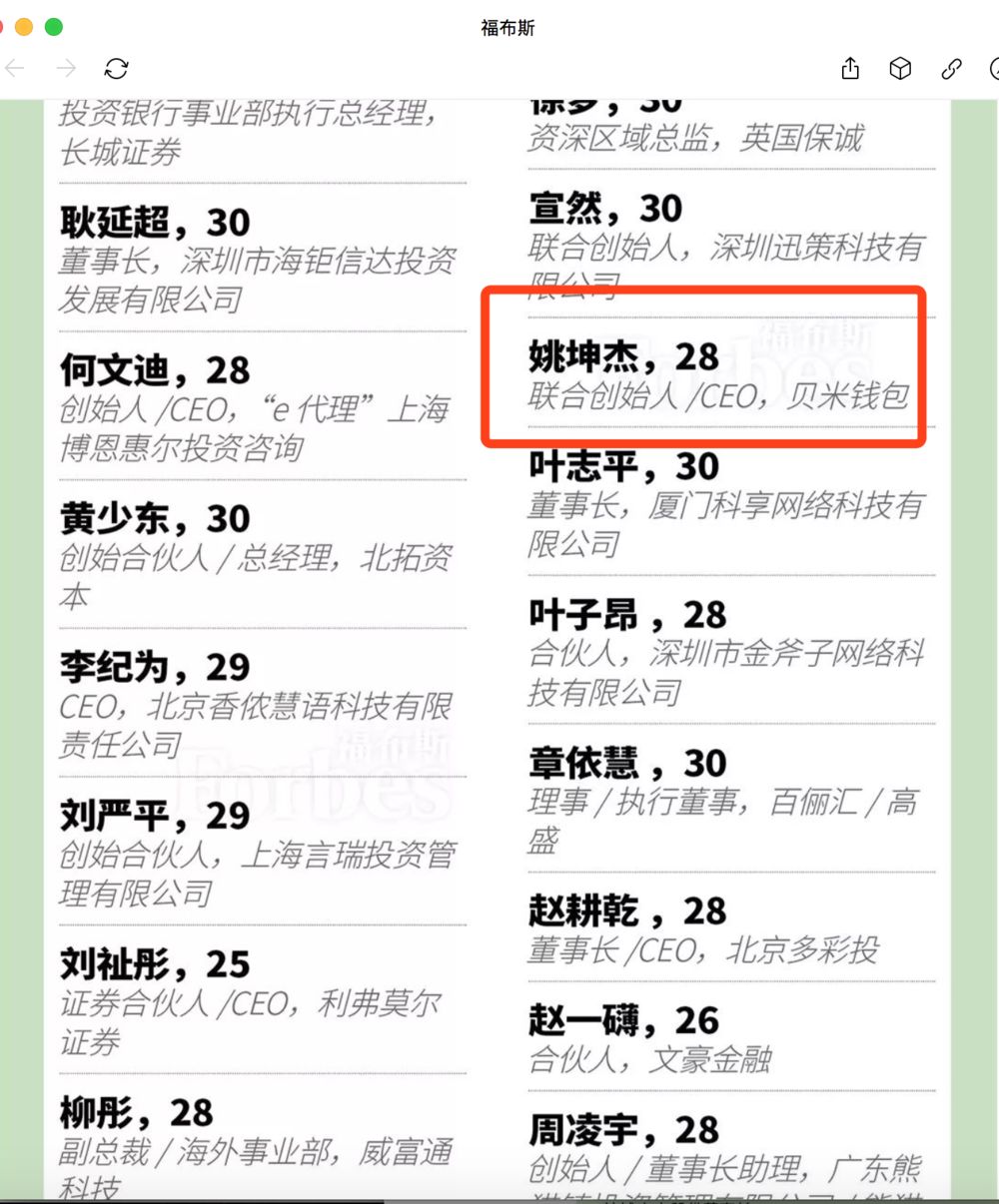 另外不得不说的是,最近的P2P爆雷炸得人心惶惶,其中就包括贝米钱包,涉及北京40多亿元未兑付,其CEO姚坤杰被取保候审。而戏剧性的是,这位被取保候审的CEO赫然出现在了福布斯今天的财务与金融板块的30岁以下榜单上。