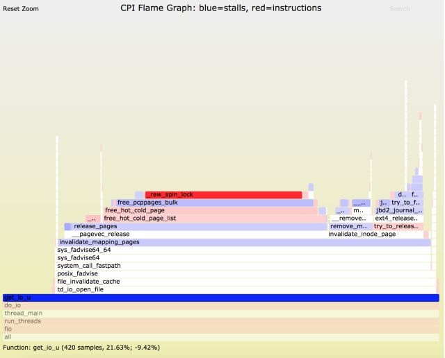现在,我们可以使用 CPI 火焰图来分析一个略真实一些的测试场景。下面的 CPI 火焰图,来自 fio的测试场景。