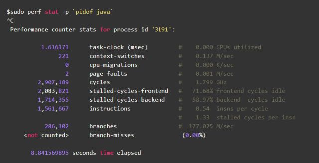 例如,下例就可以给出 Java 程序的 IPC,8 秒多的时间里,这个 Java 程序的 IPC 是 0.54: