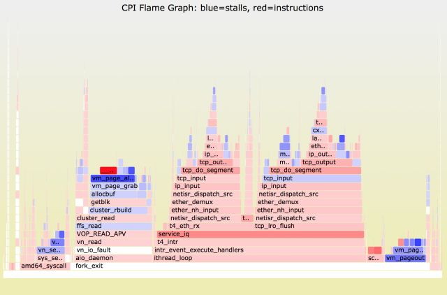 $ FlameGraph/difffolded.pl -n out.folded.stalls out.folded.cycles | FlameGraph/flamegraph.pl --title "CPI Flame Graph: blue=stalls, red=instructions" --width=900 > cpi_flamegraph_small.svg