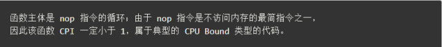 通常情况下,通过 CPI 的取值,我们可以大致判断一个计算密集型任务,到底是 CPU bound 还是 Memory Bound: