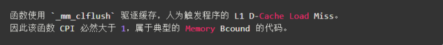 而 memory_bound 是蓝色的,代表这个函数发生了严重的访问内存的延迟,导致了流水线停顿,属于忙等