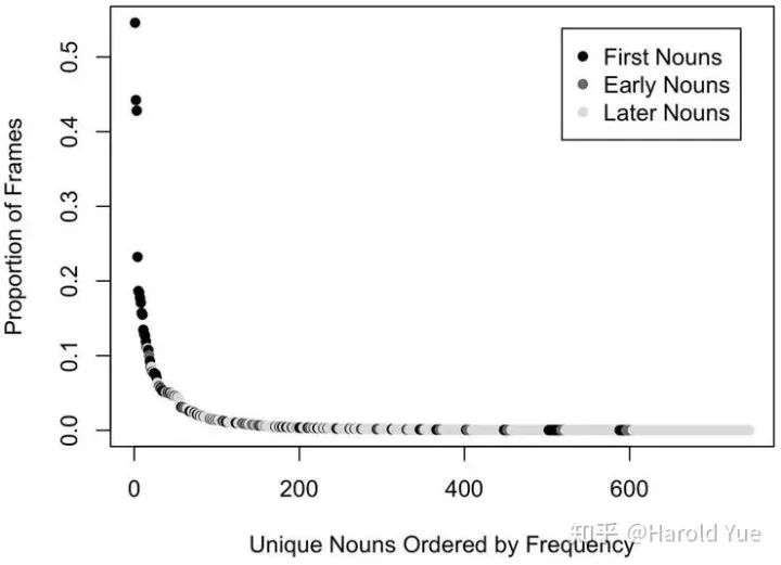 首先是婴儿对人脸的体验,婴儿出生后一年中,看到的人脸主要主要集中在几个人身上,出现最多的三个人的人脸大概占所有人脸的80%。与此相对,在物体的体验也体现出了类似的规律,大致服从一个幂律分布,大部分物体出现的频率很低,少数几种物体出现的频率很高。