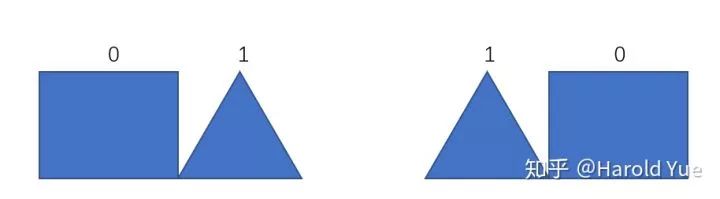 如下图5。定义长方形为0, 三角形为1. 人类在大量的视觉体验中学到了长方形和三角形的表征分别为0和1. 当遇到新的样本,左图时,人类知道这是一个01样本,当后续继续出现这样的样本时,人类知道这是01,和之前的01从属一类。而遇到新样本,右图,知道这是一个10样本,其他同理。