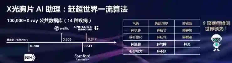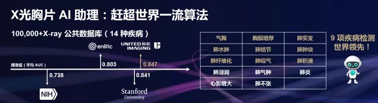 以智能体检读片为例,该应用基于20万病例数据进行深度学习,能够对14种常见的肺部疾病和疑似病灶进行标注,目前在肺结节、肺水肿等9项肺部疾病的诊断精准度上达到世界顶尖的水准,超过美国国立卫生院、美国斯坦福大学相关研发团队。
