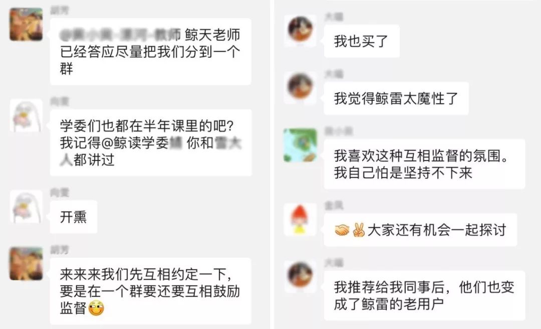 鲸雷计划为每一堂读书课都准备了一个高质量的书友社群,每一天听课以后,书友们都会针对刚刚听到的观点进行讨论,在讨论中交到好朋友(或者随便是什么奇怪的关系)的大有人在。