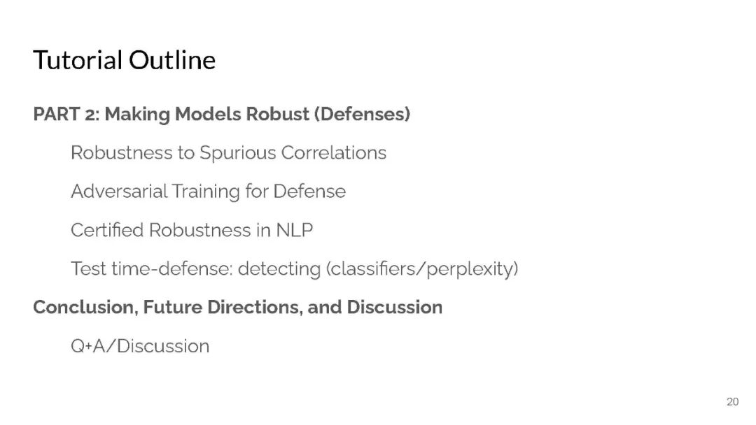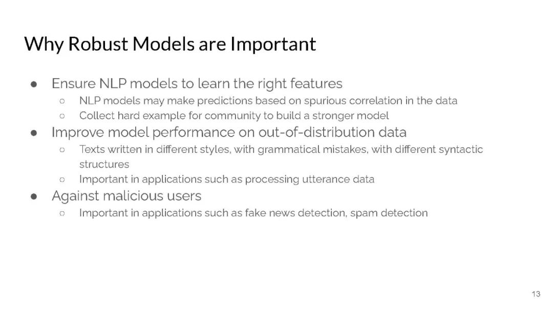 最近的研究表明,许多NLP系统对输入的微小扰动非常敏感和脆弱,并且不能很好地在不同的数据集上进行泛化。这种鲁棒性的缺乏阻碍了NLP系统在真实应用中的使用。本教程旨在让人们意识到有关NLP鲁棒性的实际问题。它的目标是对构建可靠的NLP系统感兴趣的NLP研究人员和实践者。特别地,我们将回顾最近关于分析NLP系统在面对对抗输入和分布转移数据时的弱点的研究。我们将为观众提供一个全面的视角