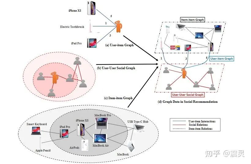 你想,用户-项目可以构成二部图(Bipartite Graph),用户与用户之间可以构成社交网络(Social Network),项目与项目之间可以存在知识图谱(Knowledge Graph),另外把这几者都考虑进去可以构成异质图(Heterogeneous Information Network),再把时间因素考虑进来而产生的动态演化而构成动态图(Dynamic Graph)。