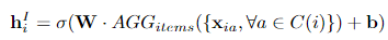GraphRec+算法的第一步是将用户和商品之间的历史行为记录视为一个带权图,使用GNN进行建模。形式化定义如下所示,即对于用户相关联的商品,使用聚合函数对商品的Embedding进行聚合,最终得到用户的特征向量。