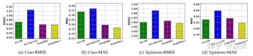 当然,这篇文章最有价值的部分还是作者做了充分的消融实验,证明了融合社交关系(w/o SN),融合用户评分(w/o Opinion),融合商品关系(GraphRec)的效果。具体消融实验结果见下图,从图中可以看到,社交关系、用户评分、商品关系均是GraphRec+取得良好预测性能的必要组件。