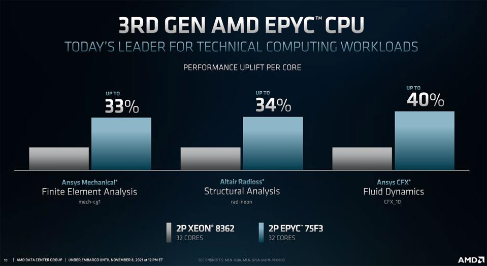 与竞品相比,AMD 声称在 Ansys 机械有限元分析工作负载中,双插槽 32 核 2P EYPC 75F3 系统优于 32 核 2P Xeon 8362 系统高达 33%。在由 Altair Radioss 进行的 Structural 分析测试中该优势高达 34%,在 Ansys CFX 流体动力学分析中高达 40%。