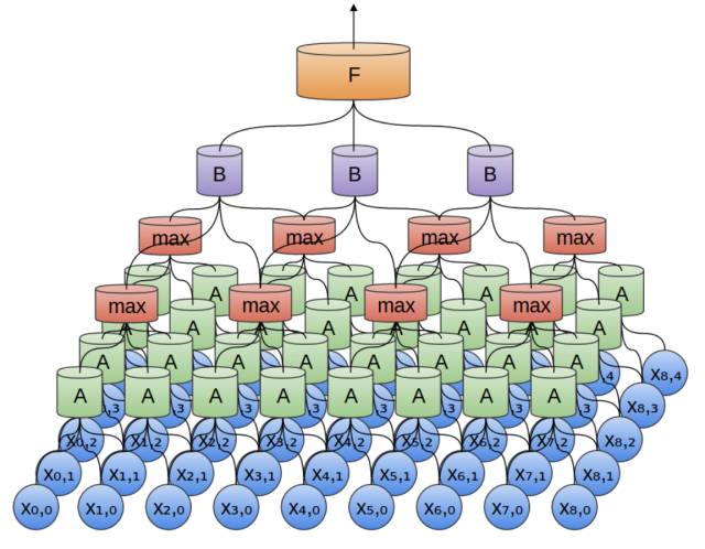 CNN通过卷积核(上图的A和B)从图像中提取特征(features),间隔地对特征作用max pooling,得到不同阶层的、由简单到复杂的特征,如线、面、复杂图形模式等,如下图所示。