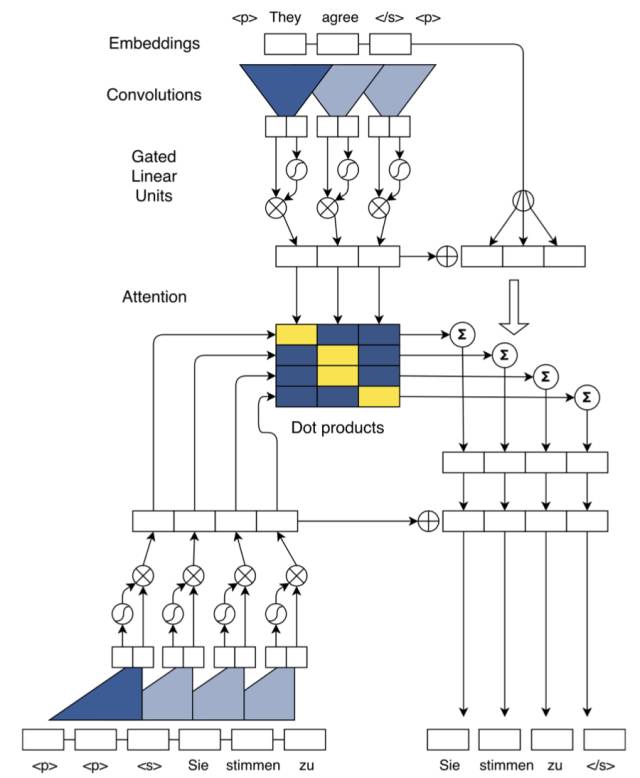 除了使用加强版的卷积网络,模型还引入了带多跳结构的注意力机制(multi-step attention)。不同于以往的注意力机制,多跳式注意力不仅要求解码器的最后一层卷积块关注输入和输出信息,而且还要求每一层卷积块都执行同样的注意力机制。如此复杂的注意力机制使模型能获得更多的历史信息,如哪些输入已经被关注过。