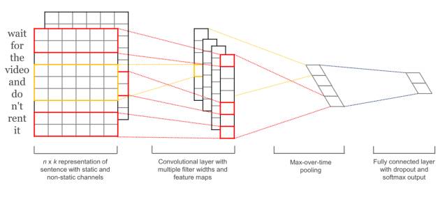 如上图所示,原文本(wait for the video and do n't rent it)由一个实数矩阵表示,这个矩阵可以类比成一张图像的像素矩阵,CNN可以像“阅读”图像一样“阅读”文本,学习并提取特征。虽然CNN提取的文本特征并不像图像特征有显然的可解释性并能够被可视化,CNN抽取的文本特征可以类比自然语言处理中的分析树(syntactic parsing tree),代表一句话的语法层级结构。