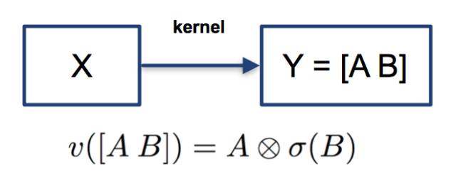 该非线性变换被称为Gated Linear Unit (GLU)[10]。它将卷积后的结果分成两部分,对其中一部分作用sigmoid变换,即映射到0到1的区间之后,和另一部分向量进行element-wise乘积。