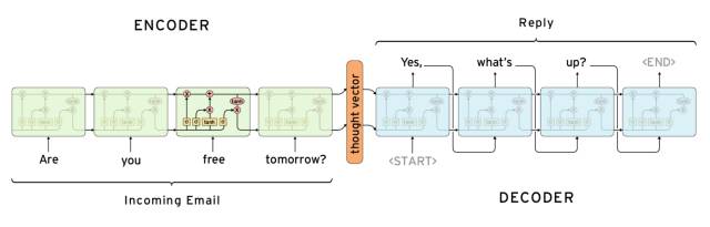 图中展示的是一个用于自动回复邮件的模型,它的编码器和解码器分别由四层RNN的变种LSTM[5]组成。图中的向量thought vector编码了输入文本信息(Are you free tomorrow?),解码器获得这个向量依次解码生成目标文本(Yes, what's up?)。上述模型也可以自然地用于自动文本摘要任务,这时的输入为原文本(如新闻),输出为摘要(如新闻标题)。