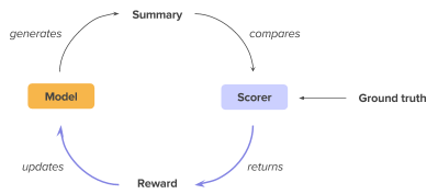 但对于文本摘要,仅仅考虑最大似然并不够。主要有两个原因,一是监督式训练有参考“答案”,但投入应用、生成摘要时却没有。比如t时刻生成的词是"tech",而参考摘要中是"science",那么在监督式训练中生成t+1时刻的词时,输入是"science",因此错误并没有积累。但在实际应用中,由于没有ground truth,t+1时刻的输入是错误的"tech"。这样引起的后果是因为没有纠正,错误会积累,这个问题被称为exposure bias。另一个原因是,往往在监督式训练中,对一篇文本一般只提供一个参考摘要,基于MLE的监督式训练只鼓励模型生成一模一样的摘要,然而正如在介绍中提到的,对于一篇文本,往往可以有不同的摘要,因此监督式学习的要求太过绝对。与此相反,用于评价生成摘要的ROUGE指标却能考虑到这一灵活性,通过比较参考摘要和生成的摘要,给出摘要的评价(见下文评估摘要部分)。所以希望在训练时引入ROUGE指标。但由于ROUGE并不可导的,传统的求梯度+backpropagation并不能直接应用到ROUGE。因此,一个很自然的想法是,利用强化学习将ROUGE指标加入训练目标。